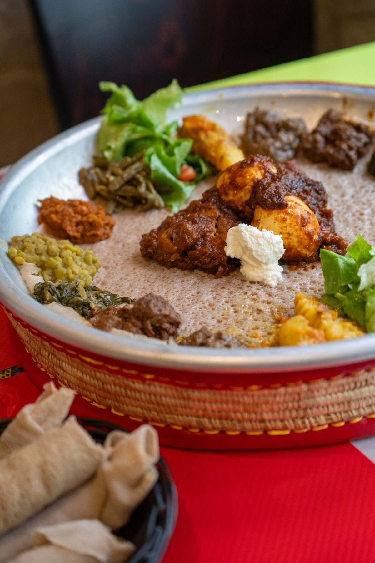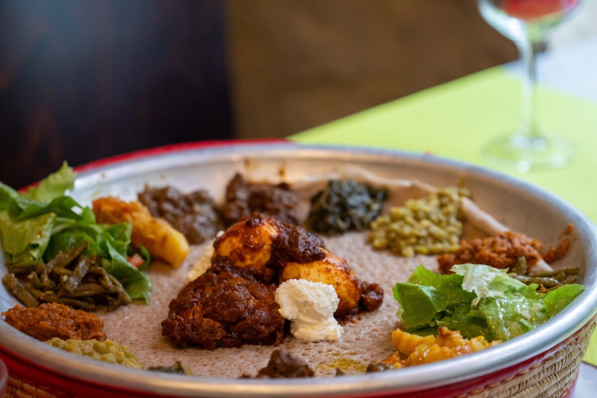 La carte propose une cuisine traditionnelle éthiopienne, généreuse, relevée sans jamais être agressive, où les saveurs s’entrelacent autour d’un grand plateau à partager. Mention spéciale à l’injera, cette galette moelleuse et légèrement acidulée qui sert à la fois de pain, de couverts, et de fil conducteur du repas. Les plats mijotés, souvent à base de lentilles, de viande tendre ou de légumes parfumés, dévoilent une complexité aromatique étonnante.