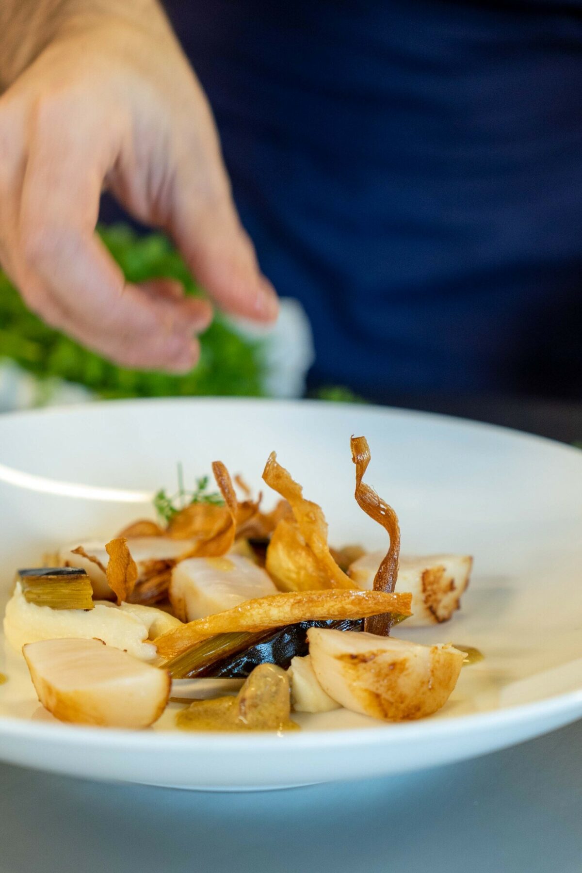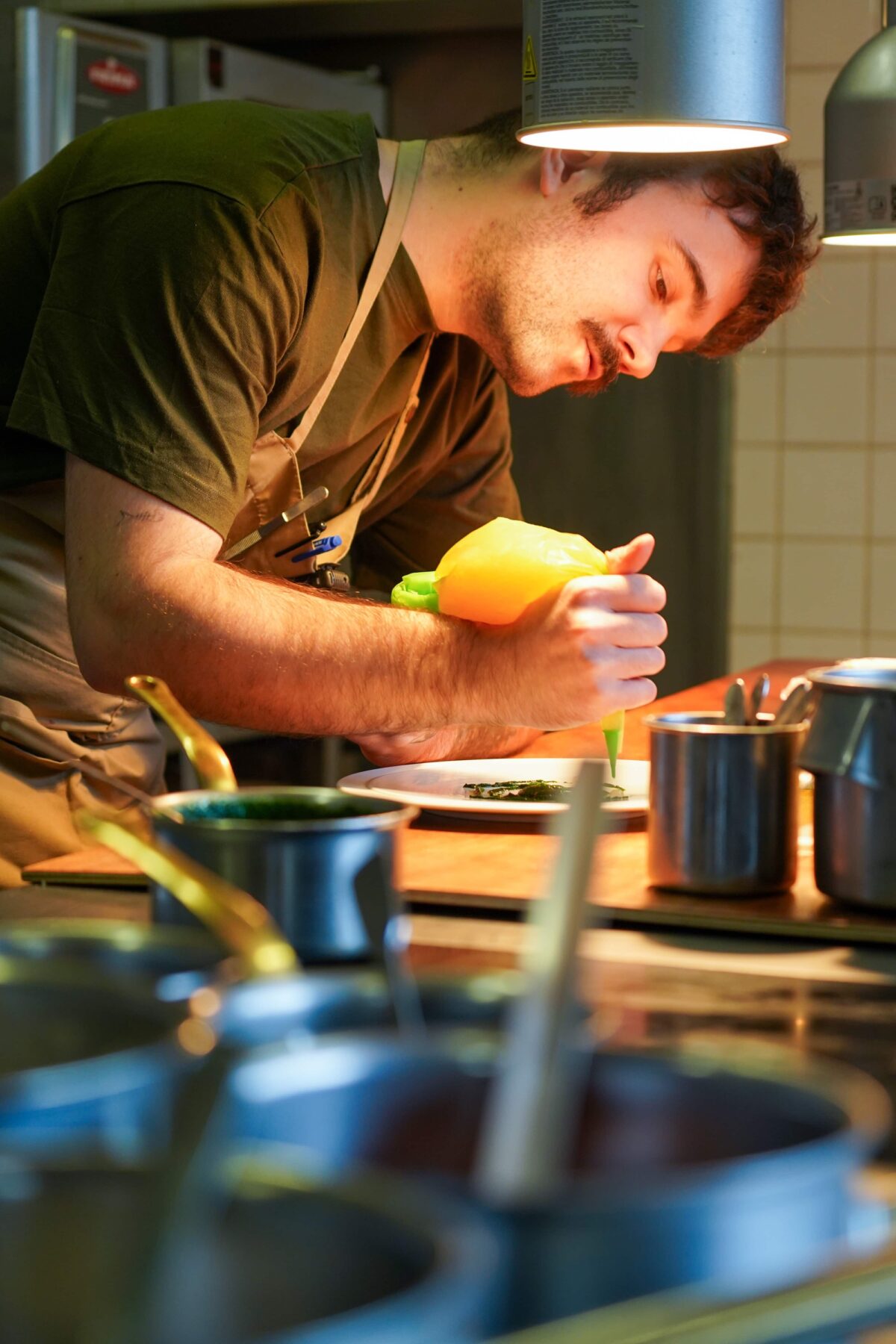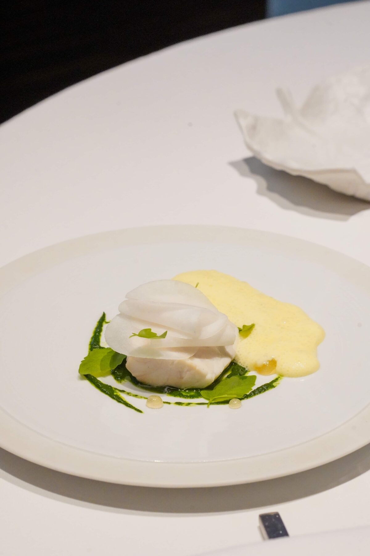 Aux commandes, Justin Berment, jeune chef passé par Cancan et l’Odas, reste concentré derrière les fourneaux, sans chercher à occuper la scène – une retenue qui donne tout son poids à l’assiette. Le concept : un menu unique, imposé, sans carte, à 70€, dévoilé au rythme des services, dans un format resserré mais soigné. Peu de plats, oui, mais un travail de fond visible dans chaque composition, parfois encore un peu trop réfléchi, mais toujours sincère.